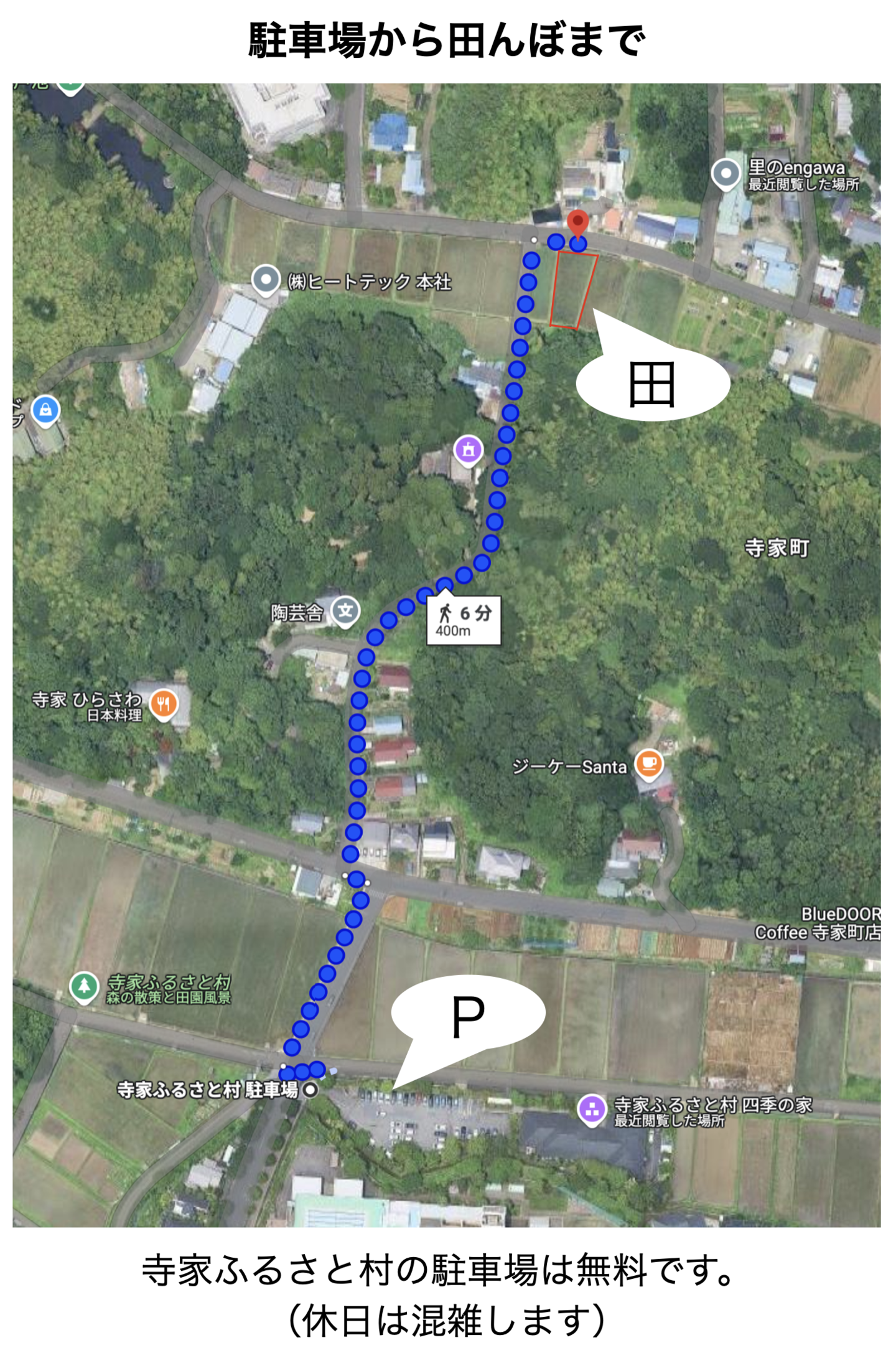 ・寺家ふるさと村の駐車場(田んぼから徒歩5分)をご利用ください(無料)